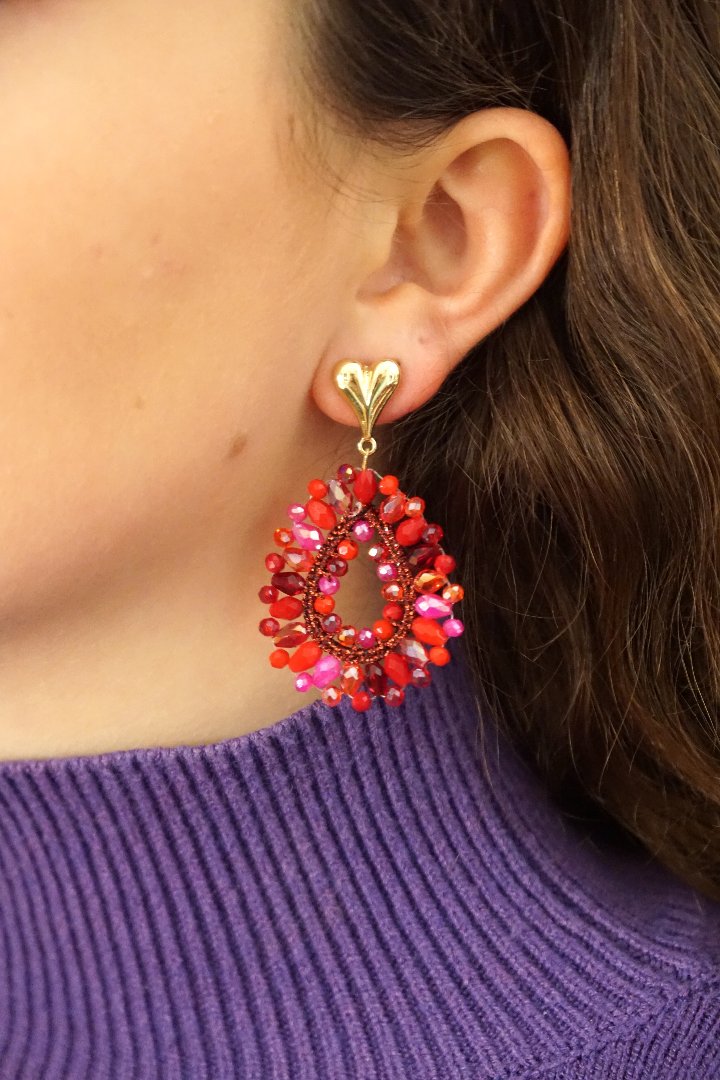 Tropfen aus rötlichen Kunststeinen mit rotem Glitzerfaden. Goldfarbener glatter/plastischer Stecker in Herzform.