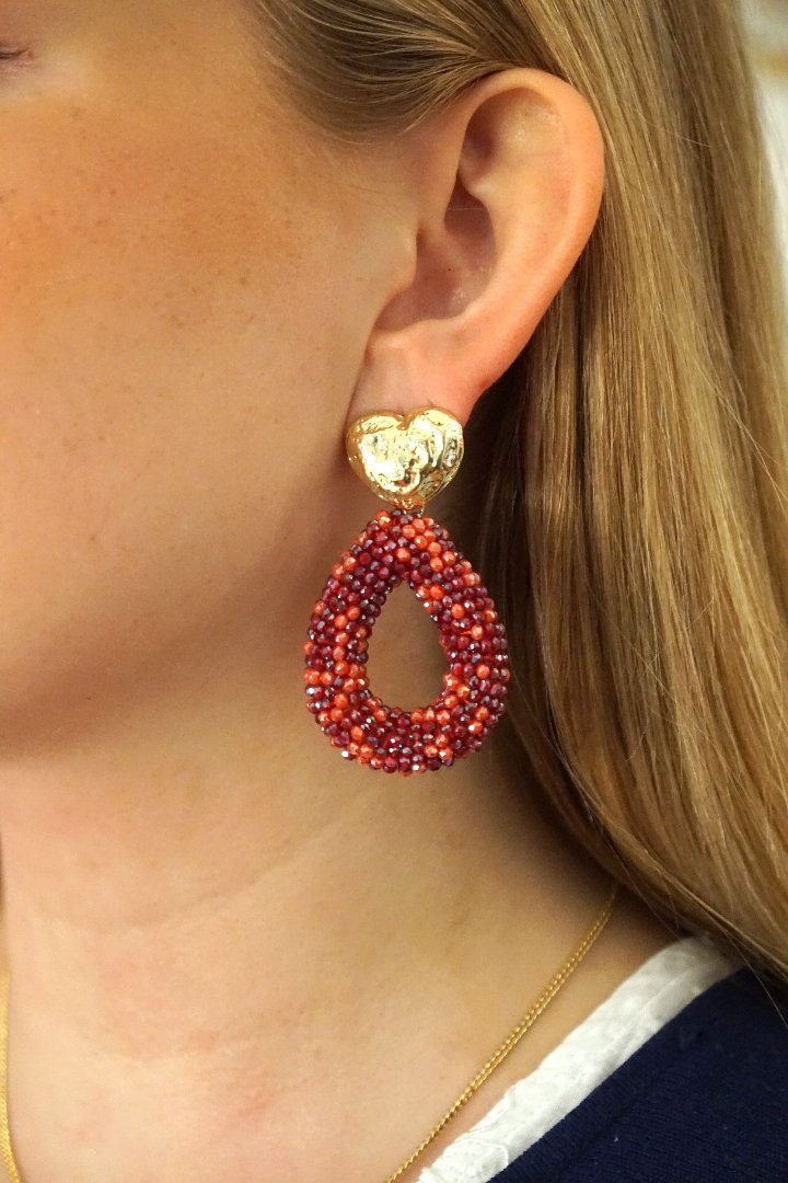 Tropfen aus rötlich glitzernden Kunstkristallen. Goldfarbener Herzstecker mit unregelmäßig strukturierter Oberfläche.