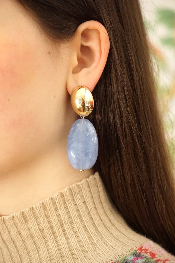 Ellipsoide aus hellblauem marmoriertem Kunststein. Goldfarbener ovaler Stecker.